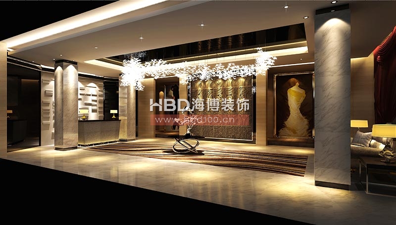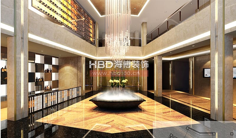 大廳的設計強調線形流動的變化,色彩華麗,暗黃色的天花燈槽、閃耀著異樣光芒的水晶燈飾,無不呈現富麗堂皇的景象。每一處細節恰到好處的處理給俱樂部加分,大型水晶吊燈靜靜地泛著影影綽綽的燈光,朦朧、浪漫之感油然而生,風情萬種。舒適的座椅、極具創意的燈飾、櫥窗邊的略帶點中式風格的雕塑、唯美的水池,整個俱樂部溫馨如家,讓到訪者的心情更為愉悅放松!
